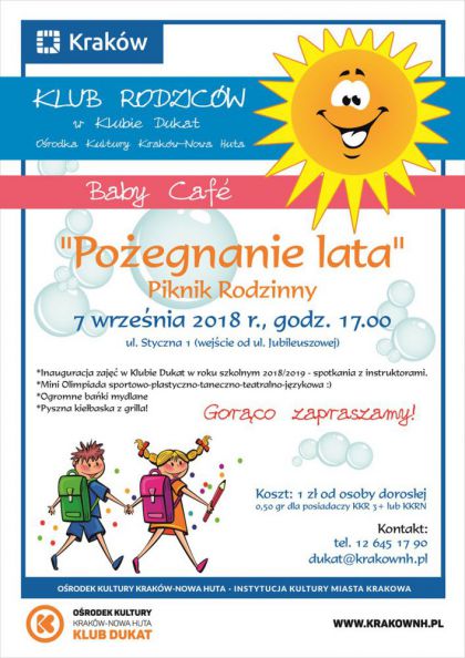 Klub Dukat Ośrodka Kultury Kraków-Nowa Huta (ul. Styczna 1) zaprasza 7 września w godz. 17.00-19.00 na spotkanie z cyklu Baby Café, organizowane w ramach Klubu Rodziców. Początek roku szkolnego to często duże wyzwanie i niemały stres zarówno dla dzieci jak i ich opiekunów. Aby na chwilę oderwać się od codzienności, zapraszamy rodziny do wspólnej zabawy, zorganizowanej w formie pikniku. Na uczestników czekają liczne animacje, konkursy, rodzinne współzawodnictwo, malowanie twarzy, szaleństwa z chustą Klanzy i słodki poczęstunek.