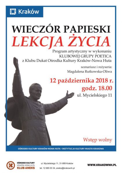 Klub Aneks Ośrodka Kultury Kraków-Nowa Huta (ul. A. Mycielskiego 11) zaprasza na program artystyczny w dniu 12 października o godz. 18.00. Przypadająca w tym roku 40 rocznica wyboru kardynała Karola Wojtyły na papieża i zbliżający się - obchodzony przez Kościół katolicki w Polsce 16 października - Dzień Papieski, stanowią okazję do przypomnienia życia i misji Jana Pawła II. Artystycznej interpretacji treści papieskiego nauczania podejmie się Klubowa Grupa Poetica z zaprzyjaźnionego Klubu Dukat, którą tworzą mieszkańcy Grębałowa. Reżyserem przedstawienia jest Magdalena Rutkowska-Oliwa.