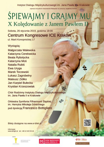 Instytut Dialogu Międzykulturowego im. Jana Pawła II w Krakowie już po raz 10 zaprasza na wspólne kolędowanie podczas koncertu Śpiewajmy i grajmy Mu! X Kolędowanie z Janem Pawłem II, który odbędzie się 26 stycznia 2019 roku o godz. 18:00 w Centrum Kongresowym ICE Kraków.