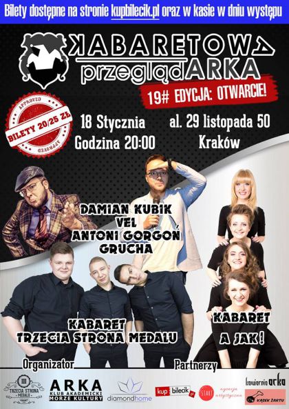 Nowy rok otwieramy z przytupem! Już dziś zapraszamy Was na kolejną edycję Kabaretowej PrzeglądARKI! 19# Edycja będzie pokazem sił gospodarzy. A w programie niezmiennie kabaret z wyglądu i podejścia typowo męskiego, Stand-up + One Man Show oraz kabaret całkowicie, niepodważalnie i nieodwracalnie żeński! W repertuarze obowiązkowo piosenki i skecz wspólny. Specjalnie dla Was pełna różnorodność humorystyczna i komediowa. A dokładniej: