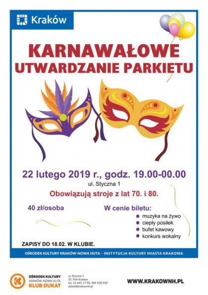Klub Dukat Ośrodka Kultury Kraków-Nowa Huta (ul. Styczna 1) zaprasza na utwardzanie parkietu. Im bliżej końca karnawału, tym noce gorętsze, nogi same rwą się do tańca i z oddali dobiegają dźwięki samby rodem z Rio do Janeiro. Szkoda tracić czas, pora ruszać w tan! Szaleństwo piątkowej nocy w przedostatni weekend karnawału, odbywać się będzie w rytmach lat '70 i '80. Bawić będziemy się przy muzyce na żywo!