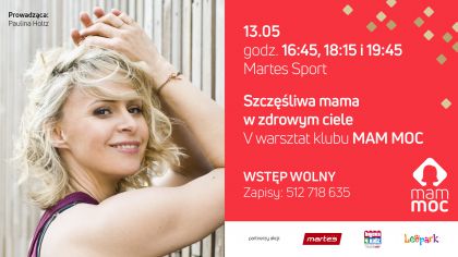 Każdy z nas wie, jak ważna jest codzienna aktywność. To nie tylko wzmocnienie ciała czy poprawa kondycji, ale również niezawodny zastrzyk endorfin i recepta na zdrowie. Jednak aby móc cieszyć się zdrowym ciałem jak najdłużej, trzeba dostosować formę treningu do swoich predyspozycji i możliwości. O to jak dbać o siebie na co dzień, opowie uczestniczkom warsztatów „Szczęśliwa mama w zdrowym ciele” Paulina Holtz. Warsztaty odbędą się 13 maja w salonie Martes Sport w Centrum Serenada w trzech turach: o 16.45, 18.15 oraz 19.45.