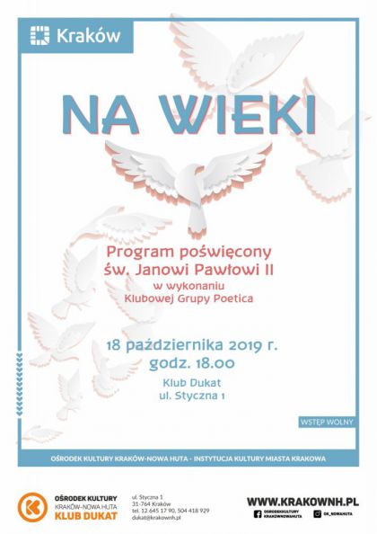 Co roku w październiku obchodzony jest Dzień Papieski. Z tej okazji Klubowa Grupa Poetica zaprasza na program poetycki przy akompaniamencie Bartosza Cieśniarskiego, dla upamiętnienia 14. rocznicy śmierci Jana Pawła II. Atmosfera ostatnich chwil życia papieża, emocje i słowa, jakie na zawsze zapamiętali zebrani przy nim wieloletni współpracownicy, staną się punktem wyjścia do poetyckich rozważań na temat znaczenia śmierci, stosunku do jej dyskretnej, lecz stałej obecności przez całe życie i sposobu przeżywania odchodzenia znajomych, najbliższych, a na koniec – nas samych.
