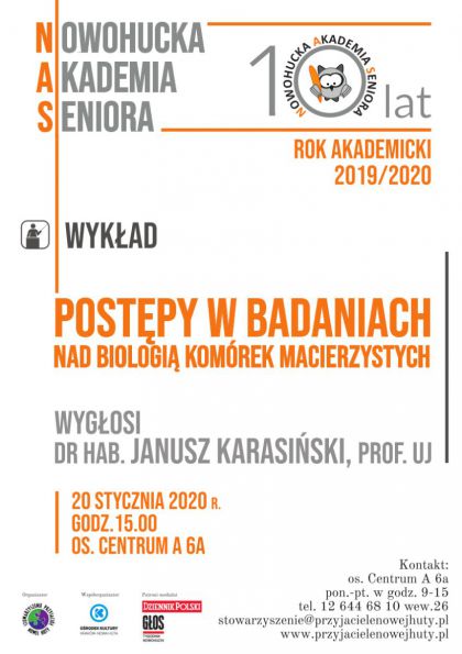 Nowohucka Akademia Seniora (os. Centrum A 6a) zaprasza 20 stycznia o godz. 15:00 na wykład "Postępy w badaniach nad biologią komórek macierzystych". Komórki macierzyste mają fundamentalne znaczenie w rozwoju wszystkich tkanek i narządów organizmu. Pełnią również ważną rolę w procesie regeneracji uszkodzonych organów. W wykładzie, który wygłosi dr hab. Janusz Karasiński prof. UJ, omówione zostaną najważniejsze, aktualne zagadnienia dotyczące biologii komórek macierzystych oraz potencjalne możliwości ich zastosowania w medycynie regeneracyjnej.