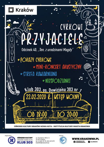 Cyrkowi Przyjaciele, to wydarzenie tytułem nawiązujące do kultowego komediowego serialu telewizyjnego, ale również do rzeczywistości. Klub 303 Ośrodka Kultury Kraków-Nowa Huta “wychował” już trzy pokolenia cyrkowców i nie zamierza przestać! Tego dnia, wychowankowie Klubu 303 wraz ze swoimi cyrkowymi (i nie tylko!) przyjaciółmi oraz ze specjalnymi gośćmi z Państwowej Szkoły Sztuki Cyrkowej w Julinku zaprezentują bogaty cyrkowo-muzyczny program artystyczny. Tak, jak bohaterowie serialu Przyjaciele zasiadali codziennie przy kawie w „Central Perk”, tak teraz my chcemy spotkać się z Wami w sobotni wieczór w Klubie 303, by w gronie przyjaciół napić się kawy lub herbaty i tak jak serialowi przyjaciele obejrzeć występy artystów na scenie. Na klubowej scenie oprócz muzyki i pokazów cyrkowo-żonglerskich zaprezentowane zostaną również umiejętności, jakich w Klubie 303 do tej pory nie było. Będzie można obejrzeć m.in. pokaz akrobatyczny na lollipopie, program na rowerze ekwilibrystycznym, oraz popis ludzkiej flagi na chińskim maszcie! Zastrzegamy sobie prawo do zmian w programie.