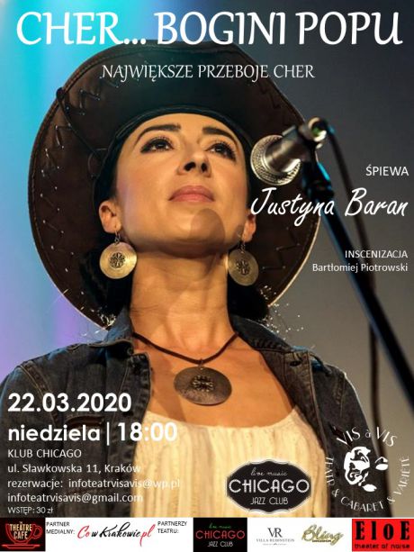 Podczas koncertu największe przeboje CHER – BOGINI POPU zaśpiewa dla Państwa artystka Teatru VIS A VIS – aktorka i wokalistka obdarzona niezwykłym głosem oraz ogromnym temperamentem scenicznym JUSTYNA BARAN.