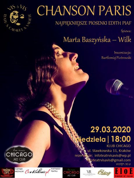 W wyjątkowym programie „CHANSON PARIS” - najpiękniejsze piosenki Edith Piaf, francuskie szlagiery oraz przeboje Ewy Demarczyk, a także wiersze Jacquesa Preverta i Haliny Poświatowskiej - zaśpiewa dla Państwa Marta Baszyńska - Wilk – aktorka scen muzycznych i wokalistka.