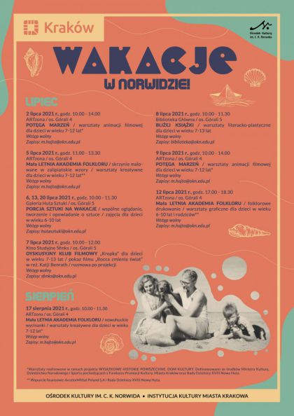 Warsztaty odbędą się w rygorze sanitarnym zgodnie z wytycznymi GIS, MKDNiS oraz wewnętrznymi regulacjami Ośrodka Kultury im. C. K. Norwida. Regulaminy wraz z procedurami bezpieczeństwa na czas epidemii COVID-19 znajdują się na stronie http://okn.edu.pl/strona-glowna/regulaminy/. Udział w warsztatach oznacza ich akceptację.