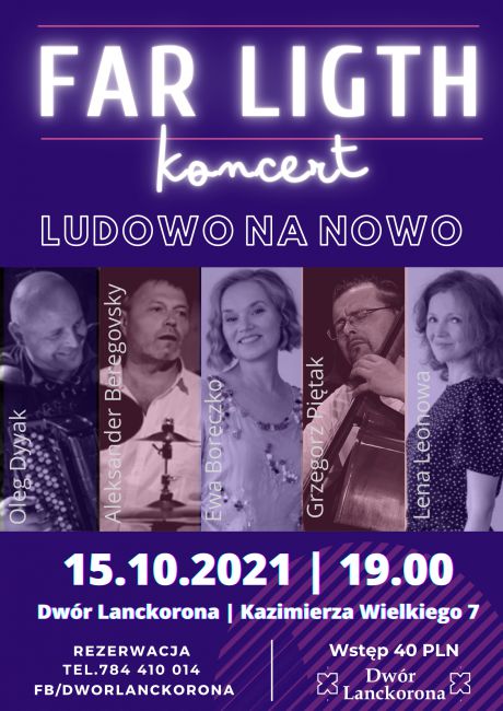 W skład zespołu "Far Light" wchodzą artyści reprezentujący bogate doświadczenie i różnorodne tradycje muzyczne. Zespół wykonuje niebanalne kompozycje na pograniczu jazzu, muzyki klasycznej oraz współczesnej, ze sporą przestrzenią do improwizacji, która daje możliwość zamanifestowania indywidualności każdego z muzyków zespołu. Projekt "Ludowo na nowo" stanowi próbę swoistego odświeżenia utworów wokalnych o charakterze ludowym przy wykorzystaniu środków muzyki współczesnej. Proste melodie ludowe zostały zaaranżowanie na głos klasyczny z dodaniem bardziej złożonego akompaniamentu z nowoczesnymi środkami harmonicznymi i brzmieniowymi, ale z zachowaniem ducha muzyki ludowej - jej szczególnej ekspresji i motoryczności.