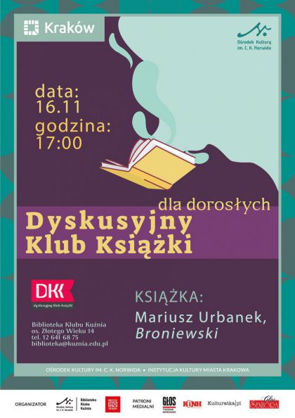 Zapraszamy na spotkanie Dyskusyjnego Klubu Książki dla dorosłych na rozmowę o książce Mariusza Urbanka, zatytułowanej „Broniewski. Miłość, wódka, polityka". Spotkanie poprowadzi Barbara Cygan. Dyskusyjne Kluby Książki tworzą czytelnicy, których łączy pasja czytania i poznawania nowych książek. Klubowicze spotykają się w raz w miesiącu, żeby dyskutować o wcześniej wybranej i przeczytanej książce.