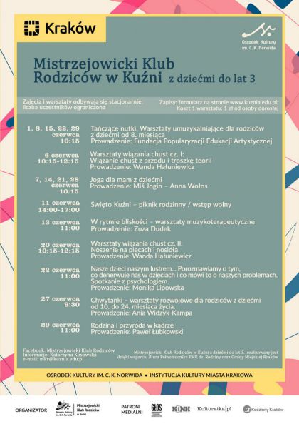 Na zajęcia obowiązują zapisy przez formularz dostępny od 27 V, od godz. 11.00 na stronie www.kuznia.edu.pl w zakładce Mistrzejowicki Klub Rodziców.