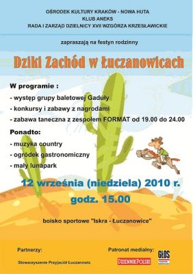 12 września w godz. 15.00 - 24.00 Klub Aneks Ośrodka Kultury Kraków - Nowa Huta (ul. Mycielskiego 11) zaprasza na festyn rodzinny "Dziki Zachód w Łuczanowicach". Impreza odbędzie się na boisku Klubu Sportowego „Iskra – Łuczanowice”. W programie m.in.: występ grupy baletowej Gaduły, muzyka country, ujeżdżanie rumaków, szukanie złota, łapanie na lasso, konkursy i zabawy z nagrodami, robienie pióropuszy, mini lunapark, rodzinne zmagania, malowanie amuletów i twarzy, zabawa taneczna, mała gastronomia. Impreza realizowana wspólnie z Radą Dzielnicy XVII Wzgórza Krzesławickie. Wstęp wolny.