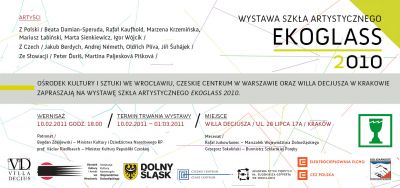 10 lutego (czwartek), o godz. 18.00, w Willi Decjusza odbędzie się wernisaż poplenerowej wystawy Ekoglass Festiwal 2010. Na wystawie zaprezentowane zostaną prace dwunastu artystów z Czech, Polski i Słowacji, które powstały w czasie plenerów w historycznych ośrodkach hutnictwa szkła w Szklarskiej Porębie (PL) oraz Desnej (CZ). W wernisażu wezmą udział artyści czescy: Jakub Berdych, Jíří Šuhájek, Andrej Nèmeth, Oldřich Plíva i polscy: Mariusz Łabiński i Igor Wójcik. Ekspozycji towarzyszy film dokumentalny prezentujący proces powstawania eksponowanych dzieł w czasie obu plenerów.