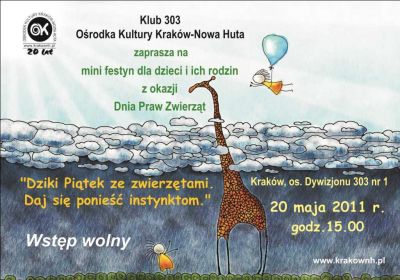Klub 303 Ośrodka Kultury Kraków-Nowa Huta zaprasza na imprezę plenerową dla dzieci i ich rodzin z okazji Dnia Praw Zwierząt. Podczas mini festynu zorganizowane zostaną konkursy i warsztaty plastyczne.
