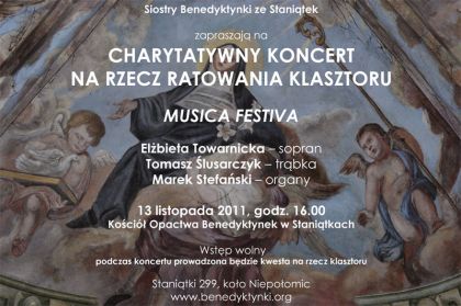 w tym roku koncert charytatywny na rzecz Klasztoru Sióstr Benedyktynek w Staniątkach. Tym razem zabrzmią najpiękniejsze arie wokalne oraz pełne blasku utwory na trąbkę i organy, w mistrzowskim wykonaniu Elżbiety Towarnickiej – sopran, Tomasza Ślusarczyka – trąbka oraz Marka Stefańskiego – organy. Podczas koncertu zbierane będą datki na ratowanie bezcennego zabytku historii i architektury, jakim jest staniątecki klasztor. Ponadto Siostry będą sprzedawały swoje wyroby, spożywcze produkowane według dawnych, sprawdzonych receptur (miód, ciastka).