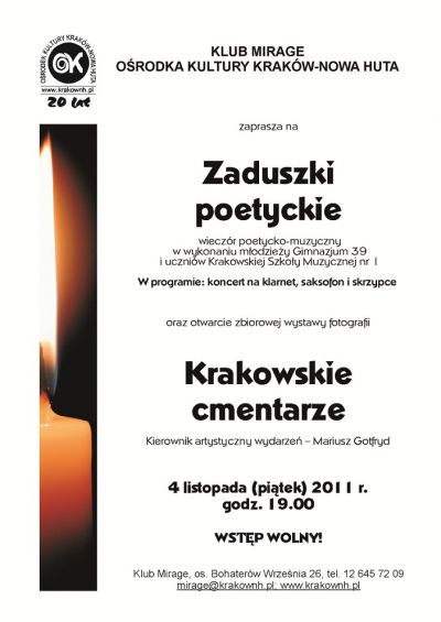 Klub Mirage Ośrodka Kultury Kraków-Nowa Huta (os. Bohaterów Września 26) zaprasza 4 listopada (piątek) 2011 r. o godz. 19.00 na wieczór poetycko – muzyczny, podczas którego uczniowie Gimnazjum nr 39 będą recytować wiersze. Imprezę uświetni koncert na skrzypce, saksofon i klarnet w wykonaniu uczennicy Krakowskiej Szkoły Muzycznej nr 1 Magdaleny Ocias.