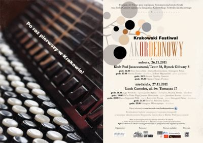26 i 27 listopada 2011 odbędzie się pierwszy w Krakowie Festiwal Akordeonowy, w zamierzeniu coroczny, którego organizatorem jest Fundacja Art Forum w tym roku przy współpracy Stowarzyszenia Instytut Sztuki oraz Lochu Camelot. W ciągu dwóch dni, trwania tego wydarzenia, usłyszymy szereg instrumentalistów i zespołów wykonujących różne style i gatunki muzyczne, jednak zawsze połączone wspólnym mianownikiem jakim jest akordeon. W programie festiwalu znajdzie się m.in.: jazz, piosenka poetycka, muzyka cygańska i francuska, argentyńskie tango oraz muzyka klasyczna jak i współczesna. Na scenie zaprezentują się znane postacie świata muzycznego, takie jak: Joanna Słowińska i Jarosław Bester, Basia Stępniak-Wilk, Jaga Wrońska oraz wschodzące gwiazdy i młode talenty polskiej muzyki: Armonia Lyrica (w składzie: Bożena Boba-Dyga - śpiew, trio akordeonowe Sirius trio: Grzegorz Palus, Grzegorz Miszczyszyn, Maciej Zimka), Django Tango Project (w składzie: Konrad Ligas - akordeon, Jacek Serczyk - gitara, Michał Rapka - kontrabas), Duo Acco-sfera (w składzie: Alena Budzinakova, Grzegorz Palus), Grzegorz Miszczyszyn, Sound Quality Quartet (w składzie: Maciej Kwarciński - flet, Jacek Kopiec – akordeon, Mateusz Frankiewicz – kontrabas, Michał Pamuła – perkusja), Maciej Zimka i gościnnie Miłosz Mączyński. Festiwal będzie się odbywał w Klubie Pod Jaszczurami i Teatrze 38 oraz w Lochu Camelot. Bilety na poszczególne koncerty i karnety festiwalowe do nabycia w Klubie Pod Jaszczurami od dnia 18.11.2011 oraz w Lochu Camelot przed koncertami.