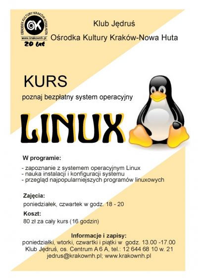 Klub Jędruś Ośrodka Kultury Kraków-Nowa Huta (os. Centrum A 6a) zaprasza na kurs systemu operacyjnego Linux.