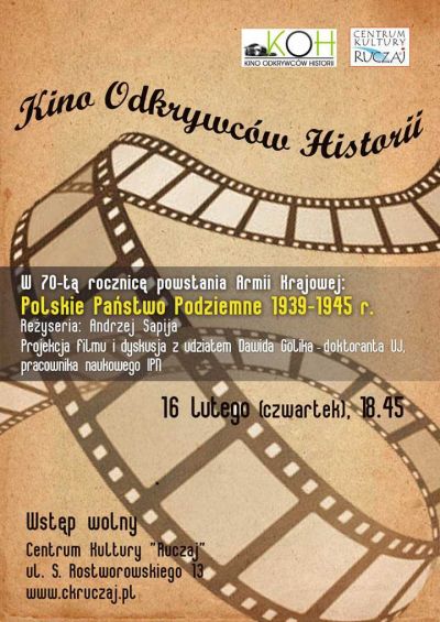 16 lutego (czwartek) o godz. 18:45 zapraszamy do Centrum Kultury "Ruczaj" na spotkanie z cyklu Kino Odkrywców Historii, w 70-tą rocznicę powstania Armii Krajowej. Zaprezentowany zostanie film "Polskie Państwo Podziemne 1939-1945 r.".