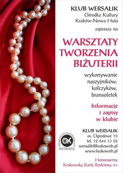 Serdecznie zapraszamy na kolejne warsztaty tworzenia biżuterii do Klubu Wersalik. Tym razem tematem zajęć będzie biżuteria z rzemienia i ceramiki. Informacje i zapisy w Klubie (12 644 13 52).