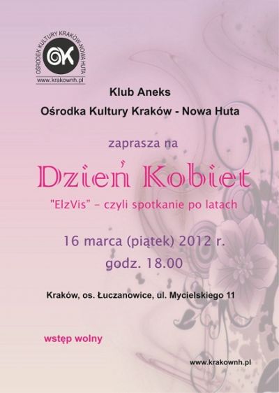Jak co roku Klub Aneks Ośrodka Kultury Kraków-Nowa Huta zaprasza mieszkanki Łuczanowic na spotkanie okolicznościowe z okazji Dnia Kobiet. Imprezę poprowadzi Radosław Omieciński.