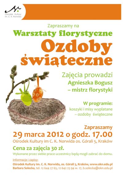Serdecznie zapraszamy do Ośrodka Kultury im. C. K. Norwida na otwarte warsztaty florystyczne. Na zajęciach układamy kompozycje z kwiatów świeżych oraz suszonych, wcześniejsze przygotowanie nie jest konieczne, gotowe kompozycje będziecie Państwo mogli zabrać ze sobą do domu.