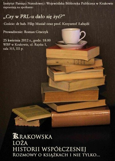 Instytut Pamięci Narodowej oraz Wojewódzka Biblioteka Publiczna w Krakowie zapraszają na spotkanie „Czy w PRL-u dało się żyć?”. Gośćmi dyskusji będą dr hab. Filip Musiał oraz prof. Krzysztof Łabędź. Prowadzenie: Roman Graczyk.