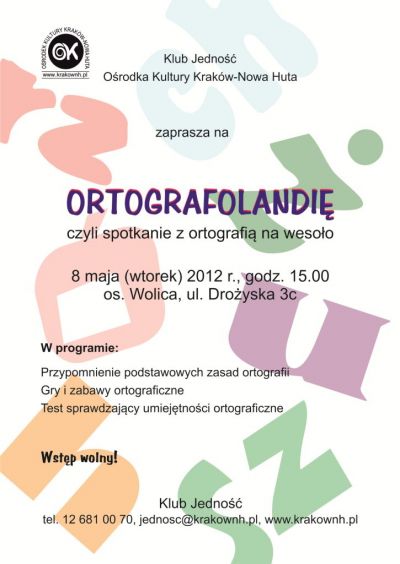 Jeżeli chcesz poznać wszystkie tajniki ortografii i zostać mistrzem w tej dziedzinie, zapraszamy do Klubu Jedność Ośrodka Kultury Kraków-Nowa Huta na spotkanie z ortografią na wesoło. Impreza adresowana jest do uczniów szkół podstawowych. W programie: przypomnienie zasad pisowni oraz gry i zabawy ułatwiające wzrokowe zapamiętywanie, które jak wiadomo jest kluczem do sukcesu. Na najlepszych czekają słodkie upominki.