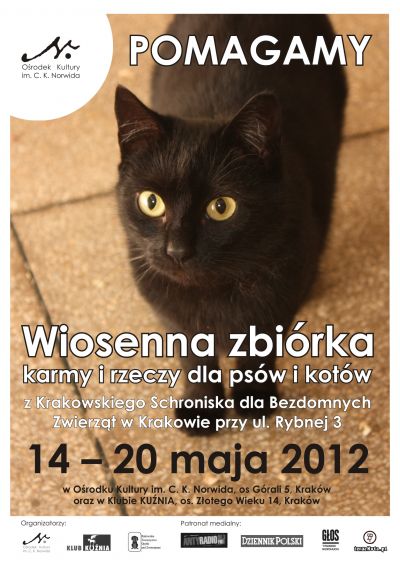 Od 14-go do 20-go maja potrwa wiosenna zbiórka karmy i rzeczy dla psów i kotów ze krakowskiego Schroniska dla bezdomnych zwierząt w Krakowie przy ul. Rybnej 3. Akcja prowadzona jest we współpracy z Krakowskim Towarzystwem Opieki nad Zwierzętami.