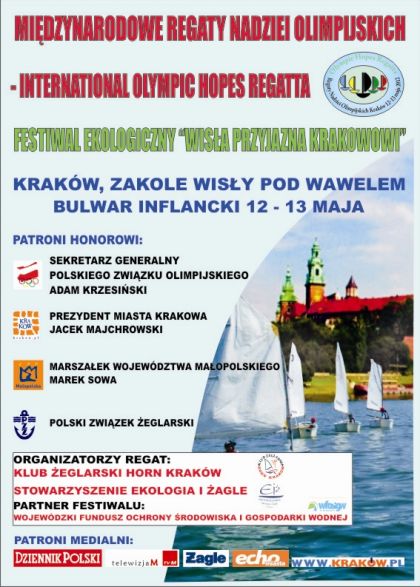 W najbliższą sobotę i niedzielę 12 i 13 maja zapraszamy na Bulwary Wiślane (Bulwar Inflancki) w Krakowie, gdzie zostaną rozegrane Międzynarodowe Regaty Nadziei Olimpijskich. Regaty będą rozgrywane w klasach Laser 4,7, Laser Radial, Europa oraz Optimist. Zgłoszenia zawodników przyjmowane będą do godz. 10.30 w sobotę 12 maja.