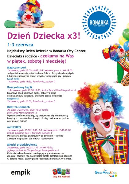 Maraton rozrywki rozpocznie się 1 czerwca, kiedy to w Bonarka City Center swe podwoje otworzy „Ma-giczny port” – jedyne wesołe miasteczko w Polsce gwarantujące gimnastykę dla ciała i umysłu. Na chętnych czeka aż kilkanaście wciągających gier i zabaw. Wesołe miasteczko działać będzie do niedzieli włącznie. Best 4 You Kids przez trzy dni zapraszać będzie dzieci do rozrywkowego kącika. Balonowe zoo i kolorowe buźki, zabawy z piłką oraz kalambury i zgadule. Regularne przejażdżki po centrum handlowym odbywać będzie dziecięcy pociąg. Żadnych biletów nie trzeba, wystarczy uśmiech od ucha do ucha.