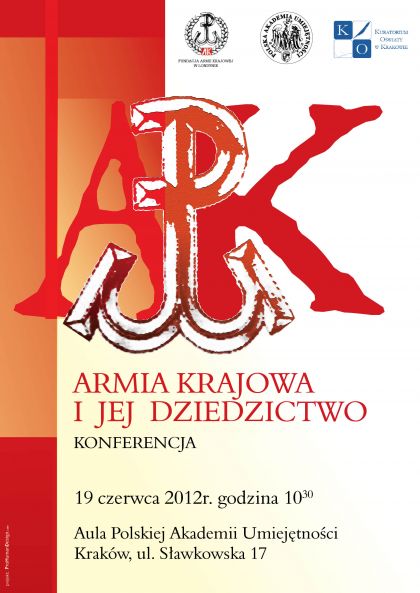 Polska Akademia Umiejętności, Małopolski Kurator Oświaty, Fundacja Armii Krajowej w Londynie zapraszają 19 czerwca 2012 r. do Auli Polskiej Akademii Umiejętności ul. Sławkowska 17 na konferencję „Armia Krajowa i jej dziedzictwo”.