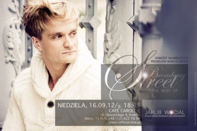 16 września o godzinie 18:45 w krakowskiej Café Caroline wystąpi Jakub Wocial z własnym Recitalem BROADWAY STREET - THE BEST OF. Usłyszeć będzie można absolutne hity amerykańskiego musicalu. MY FAIR LADY, GYPSY, NEW YORK, NEW YORK, JESUS CHRIST SUPERSTAR, LES MISÉRABLES, THE PHANTOM OF THE OPERA, CATCH ME IF YOU CAN to tylko niektóre z tytułów, które zabrzmią zaraz po wakacjach.