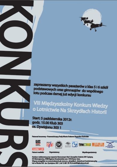 To już VIII edycja międzyszkolnego konkursu wiedzy o lotnictwie Na Skrzydłach Historii. W tym roku organizatorzy: Klub 303 Ośrodka Kultury Kraków-Nowa Huta, Dzielnica XIV Czyżyny oraz Muzeum Lotnictwa Polskiego w Krakowie, do udziału oprócz gimnazjalistów zapraszają uczniów V i VI klas szkoły podstawowej. Konkurs dla szkół podstawowych odbędzie się pod tematem przewodnim Dlaczego samolot lata?, a dla szkół gimnazjalnych Bitwa o Anglię.