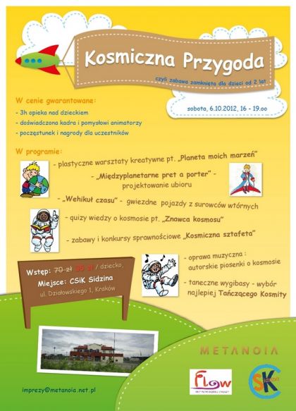 W sobotę 6 października CSiK Sidzina oraz kawiarnia Metano!a (ul. Działowskiego 1 w Krakowie) zapraszają na kalejdoskop zabaw dla dzieci od 2 roku życia zatytułowany: "Kosmiczna przygoda". Bardzo pomysłowe panie animatorki pobudzą wyobraźnię dzieci na temat Kosmosu, kosmonautów i astronomii.