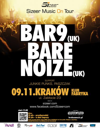 BAR9 & BARE NOIZE - długo oczekiwany występ aktualnie jednego z bardziej rozpoznawalnych duetów w Wielkiej Brytanii specjalizujących się w mocnych brzmieniach szeroko pojętego stylu dubstep. Twórcy takich hitów, jak „Piano Tune” czy „Motion” wystąpią obok nie mniej rozpoznawalnego tria z Londynu – Bare Noize, którzy znani z mocnego klubowego bassline’owego brzmienia. Artyści wyłamują się jednak ze sztywnych ram tworzenia muzyki dubstep, idąc mocno w stronę drumstepu czy electro trashu. Ten zestaw to na pewno mocno wybuchowa mieszanka, gwarantująca niezapomniane muzyczne przeżycia.