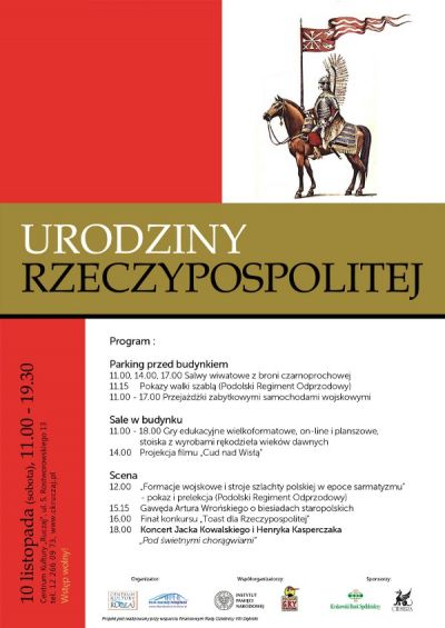 W programie m.in.: salwy wiwatowe, pokazy walki szablą, przejażdżki zabytkowymi samochodami, gry, prelekcje, konkurs na "Toast dla Rzeczypospolitej" oraz koncert Jacka Kowalskiego i Henryka Kasperczaka!!!