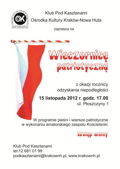 Uroczystość z okazji Święta Niepodległości, podczas której wystąpi amatorski zespół Kościelanki pod kierunkiem Elżbiety Budzeń. W Klubie Pod Kasztanami Ośrodka Kultury Kraków-Nowa Huta zaprezentowane zostaną wiersze i pieśni o tematyce patriotycznej.