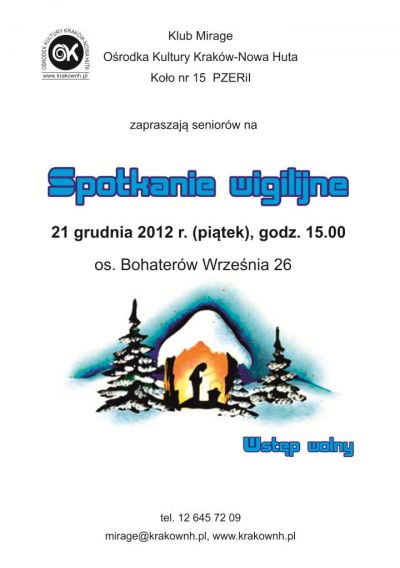 Klub Mirage Ośrodka Kultury Kraków-Nowa Huta, Koło nr 15 PZERiI zapraszają na tradycyjną imprezę z okazji Świąt Bożego Narodzenia. W programie m.in.: łamanie się opłatkiem i wspólne kolędowanie przy akompaniamencie akordeonu Stanisława Gawła.