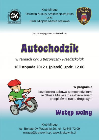 Klub Mirage Orodka Kultury Krakw-Nowa Huta (os. Bohaterw Wrzenia 26) zaprasza 16 listopada 2012 r. o godz. 11.30 na kolejne spotkanie z cyklu Bezpieczny przedszkolak.