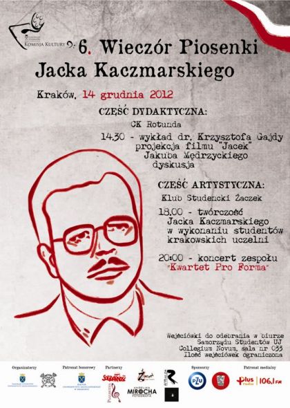 14 grudnia, ju po raz 6. Komisja Kultury Samorzdu Studentw Uniwersytetu Jagielloskiego organizuje Wieczr Piosenki Jacka Kaczmarskiego niesamowite wydarzenie kulturalne, ktre umoliwi przyblienie sylwetki oraz twrczoci tego genialnego polskiego tekciarza, muzyka, artysty.
