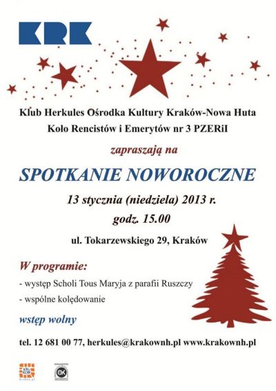 Klub Herkules Orodka Kultury Krakw-Nowa Huta (ul. Tokarzewskiego 29) zaprasza 13 stycznia 2013 r. o godz. 15.00 na Spotkanie Noworoczne.