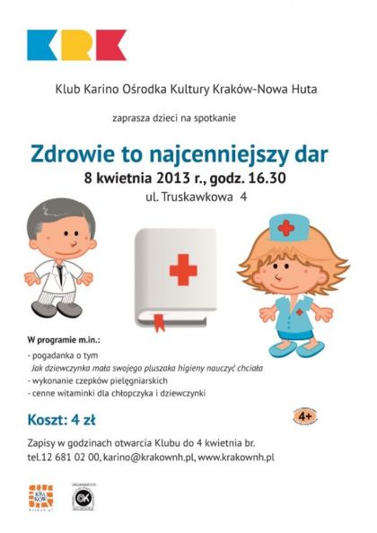 Zapraszamy dzieci do Klubu Karino Orodka Kultury Krakw-Nowa Huta (ul. Truskawkowa 4) na spotkanie z okazji Dnia Pracownika Suby Zdrowia, ktre odbdzie si 8 kwietnia br. o godz. 16.30.