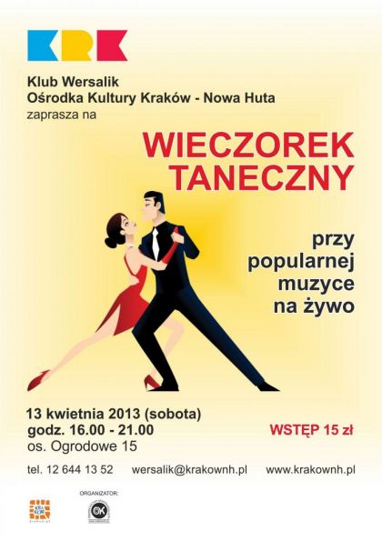 Propozycja dla osb, ktre chc spdzi sobotni wieczr bawic si na parkiecie. Zapraszamy do Klubu Wersalik Orodka Kultury Krakw-Nowa Huta(os. Ogrodowe 15) na wieczorek taneczny przy popularnej muzyce na ywo.