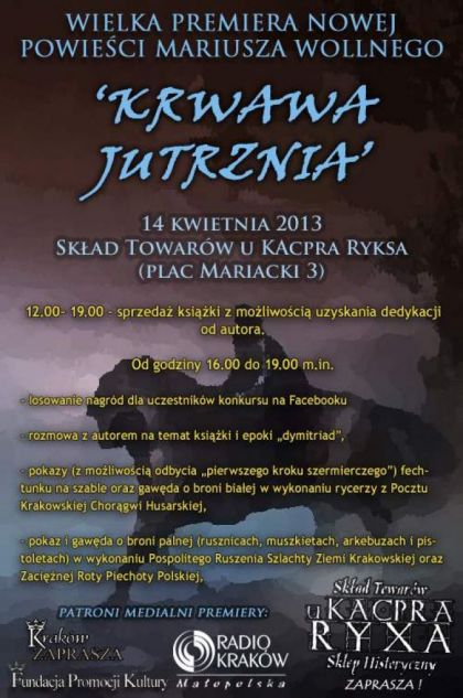 Skad Towarw u Kacpra Ryksa oraz Mariusz Wollny zapraszaj serdecznie na uroczyst premier jego nowej powieci pt. Krwawa Jutrznia. Autor znany gwnie z serii ksiek o XVI-wiecznym Inwestygatorze Krlewskim Kacprze Ryksie tym razem bierze na warsztat wydarzenia synnych dymitriad, w ktre (wbrew swojej woli) wpltany zostaje syn Kacpra, Ryx Junior