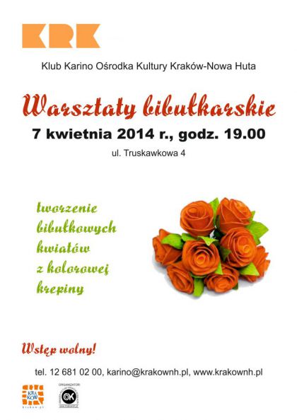 Bibukarstwo, to niezwyka forma rkodziea i nieodczny element maopolskiej tradycji. Na kwietniowych zajciach w Klubie Karino Orodka Kultury Krakw-Nowa Huta(ul. Truskawkowa 4)pozna bdzie mona techniki wykonywania bibukowych kwiatw z kolorowej krepiny. Podczas warsztatw powstan palmy, ktre zostan zgoszone na konkurs na najpikniejsz palm wielkanocn w Lipnicy Murowanej.