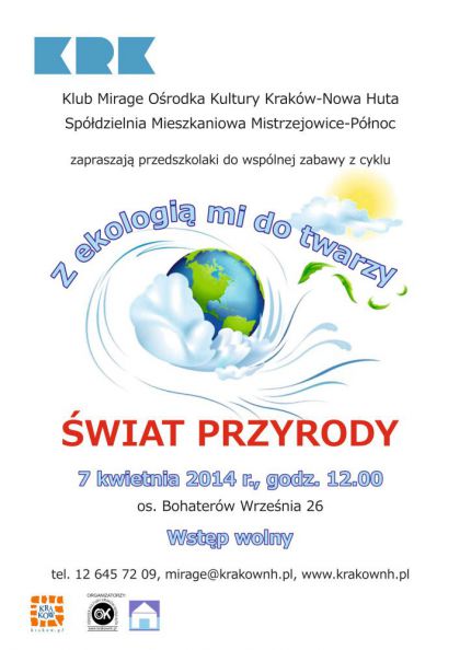 Zapraszamy przedszkolaki do wsplnej zabawy w ramach cyklu Z ekologi mi do twarzy, organizowanego przez Klub Mirage Orodka Kultury Krakw-Nowa Huta(os. Bohaterw Wrzenia 26).