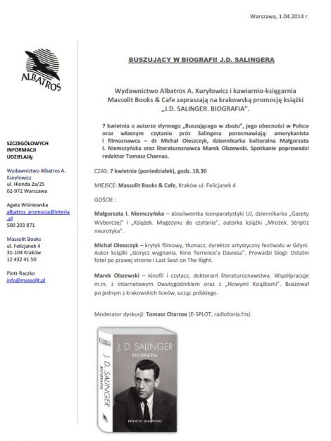 Wydawnictwo Albatros A. Kuryowicz i kawiarnio-ksigarnia Massolit Books & Cafe zapraszaj na krakowsk promocj ksiki J.D. SALINGER. BIOGRAFIA.