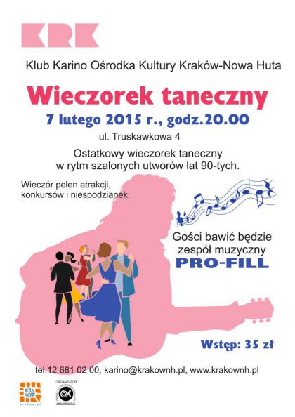 | Klub Karino Orodka Kultury Krakw-Nowa Huta (ul. Truskawkowa 4) zaprasza 7 lutego 2015 r. od godz. 20.00 na wieczorek taneczny peen atrakcji i niespodzianek. Podczas tego wieczoru nie zabraknie utworw muzycznych z szalonych lat 90-tych oraz konkursw I zabaw. Bdzie wybr krla I krlowej balu oraz gosowanie na najciekawsz mask karnawaow. Dla uczestnikw balu ostatkowego przygotowano smaczny poczstunek I niezwyk zabaw przy dwikach m(...) ... więcej » |