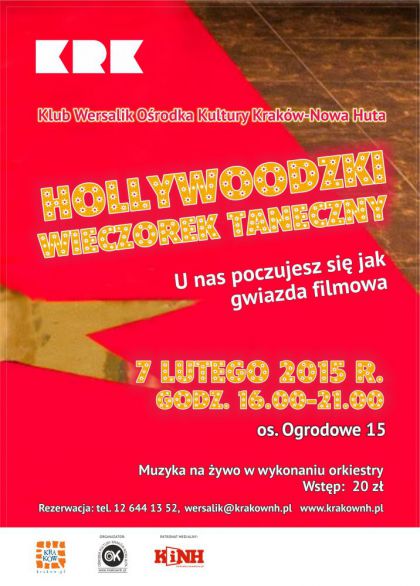 Poczuj si jak prawdziwa gwiazda! Zapraszamy 7 lutego 2015 r. w godz. 16.00-21.00 do Klubu Wersalik Orodka Kultury Krakw-Nowa Huta (os. Ogrodowe 15) na wieczorek taneczny w hollywoodzkim stylu przy muzyce granej na ywo. W programie midzy innymi: przejcie po czerwonym dywanie, lampka szampana na przywitanie, pozowanie na ciance, towarzystwo celebrytw oraz konkursy o tematyce filmowej. W przerwach przewidziana muzyka filmowa.